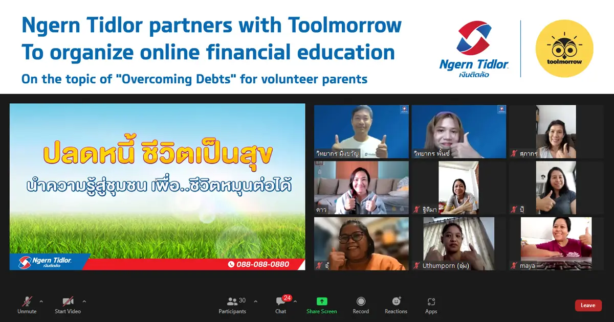 Ngern Tid Lor Public Company Limited in collaboration with Toolmorrow Co. Ltd. continued its hosting of financial planning workshops with “Overcoming Debts” designed to serve the over 30s single mother segment and their families. The online session led by Mingkwan Prasertsiwaporn, Assistant Manager Financial Education (top left) featured fun and informative teachings of the foundations of financial planning to enhance daily life for the mothers and their family members. Supported by Ministry of Social Development and Human Security (M-Society) and hosted via Zoom, the workshop furthered Ngern Tidlor’s vision to enable sustainable financial opportunities for Thai society.
