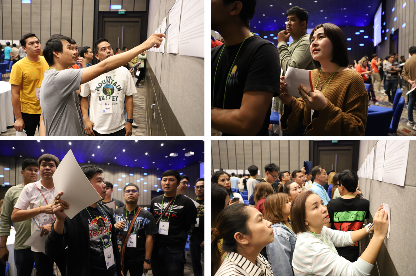 เคล็ดลับในการสร้างผู้นำของเงินติดล้อคือการเรียนรู้ผ่านกิจกรรมจริง ซึ่งมีทั้งกิจกรรม Gallery Walk ที่เปิดโอกาสให้เหล่าผู้นำได้เดินอ่าน ‘การบ้าน’ ที่นอกจากจะเป็นการทำความเข้าใจปัญหาของลูกค้าแล้ว ยังเป็นการสร้างทักษะของความเป็นผู้นำที่ดี คือการสรุปสิ่งที่ได้จากการซักถามเป็นอยู่ในปัจจุบันของน้องๆ พนักงานในความดูแลที่แสดงถึงความใส่ใจของผู้นำ