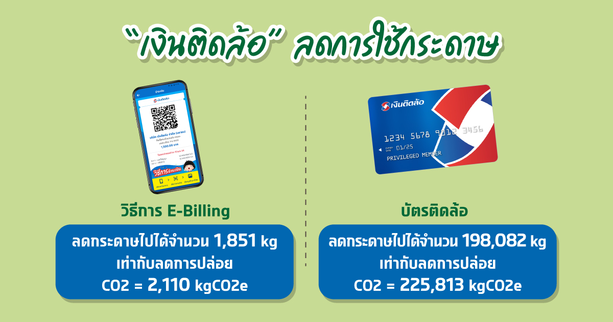 เช่นเดียวกับระบบ E-Billing (ใบเสร็จอิเล็กทรอนิกส์) โดยสนับสนุนให้ลูกค้าเปลี่ยนมารับใบเสร็จอิเล็กทรอนิกส์แทนการรับใบเสร็จกระดาษ ซึ่งอาจจะไม่ใช่เรื่องใหม่ และอาจยังเปลี่ยนไม่ได้ทั้งหมด 100% เพราะลูกค้าเงินติดล้อต้องใช้เวลาในการปรับตัว แต่ก็สามารถช่วยลดการใช้กระดาษไปถึง 1,851 กิโลกรัม และลดการปล่อยคาร์บอนไดออกไซด์ 2,110 kgCO2e ซึ่งสะท้อนให้เห็นความมุ่งมั่นของเงินติดล้อที่จะมอบบริการผ่านเทคโนโลยีที่สะดวกขึ้นให้ลูกค้า พร้อมๆ กับการให้โอกาสลูกค้าได้เป็นแนวร่วมในการสร้างโลกสีเขียวกับเงินติดล้อ”