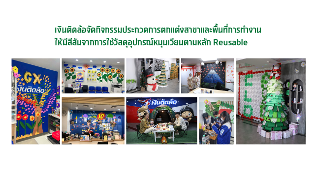 แม้การร่วมสร้างโลกสีเขียวจะเป็นภารกิจที่ชาวเงินติดล้อร่วมมือร่วมใจกันอย่างจริงจัง แต่ชาวเงินติดล้อก็ไม่เคยทิ้ง DNA ของตัวเอง โดยไม่ลืมที่จะสอดแทรกบรรยากาศของความสนุกและความคิดสร้างสรรค์ลงไปกิจกรรมต่างๆ ที่จัดขึ้นเพื่อสร้างกิจกรรมที่เหมาะสมกับพนักงานที่มีความสนใจและความชอบที่แตกต่างกันออกไป เช่น กิจกรรมประกวดการตกแต่งสาขาและพื้นที่การทำงานของแต่ละฝ่ายให้มีสีสันจากการใช้วัสดุอุปกรณ์หมุนเวียนตามหลัก Reusable และ กิจกรรมการประกวดงานศิลปะจากขยะเหลือใช้