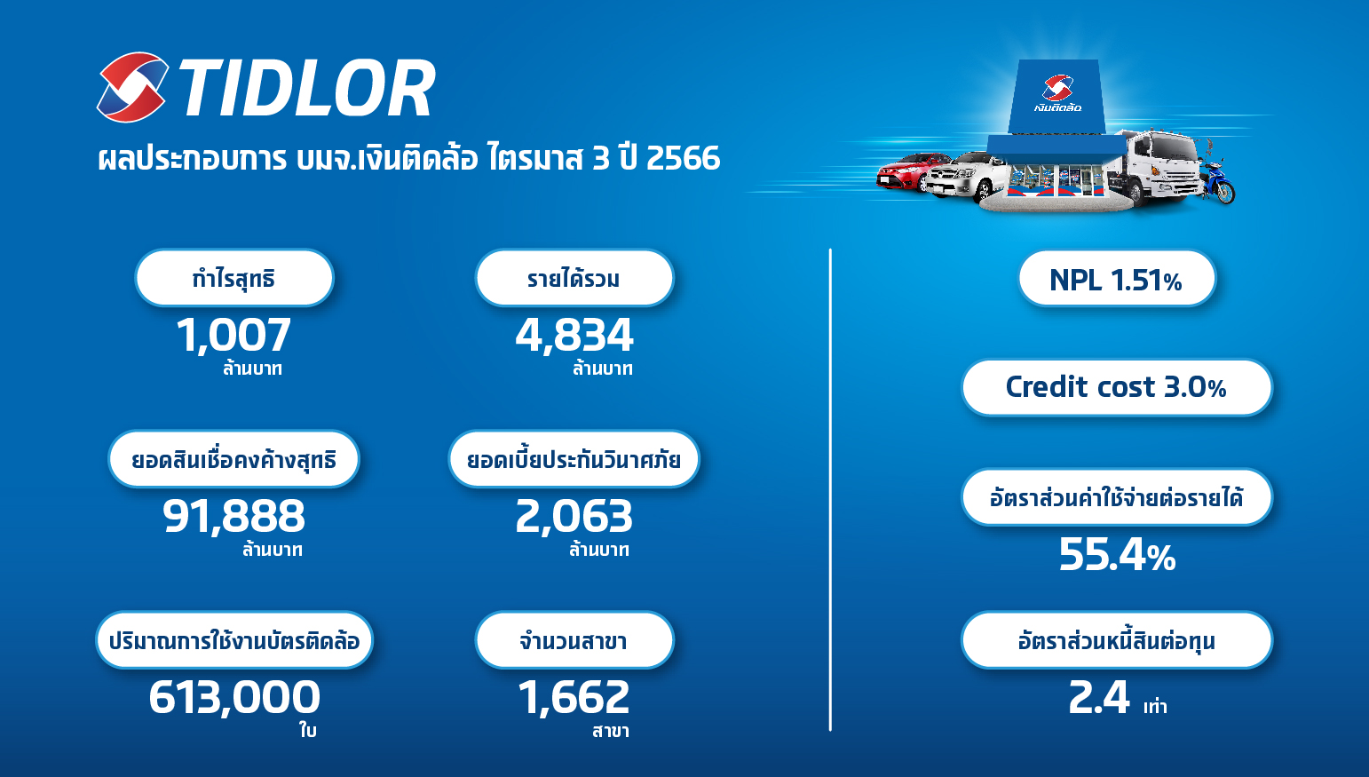 บริษัท เงินติดล้อ จำกัด (มหาชน) หรือ TIDLOR เปิดเผยผลการดำเนินงานในไตรมาส 3/66 ยังคงเติบโตตามแผนงานที่วางไว้ บริษัทฯ มีรายได้รวม 4,834 ล้านบาท เพิ่มขึ้น 23.0% YoY ในขณะที่ค่าใช้จ่ายรวมจำนวน 3,574 ล้านบาท ส่วนใหญ่เป็นผลมาจากการเพิ่มขึ้นของค่าใช้จ่ายในการขายและบริหารซึ่งเป็นผลจากการขยายตัวของธุรกิจ และต้นทุนทางการเงินที่ปรับเพิ่มขึ้นตามการเพิ่มขึ้นของอัตราดอกเบี้ยนโยบาย ด้านกำไรสุทธิสำหรับไตรมาส 3/66 จำนวน 1,007 ล้านบาท เพิ่มขึ้น 11.7% YoY และสำหรับเก้าเดือนแรกของปี 2566 บริษัทฯ มีกำไรสุทธิจำนวน 2,889 ล้านบาท เพิ่มขึ้น 2.3% YoY